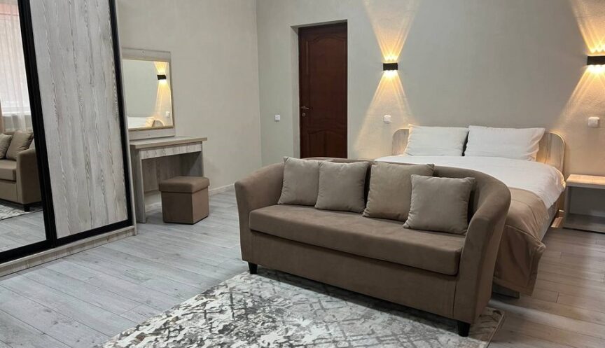 Номер с двумя комнатами. В номере есть дополнительные и основные места для размещения. Среди мебели — вешалка, диван (в том числе раскладной), зеркало, двуспальная кровать с прикроватными тумбочками, стол, стулья и шкаф.