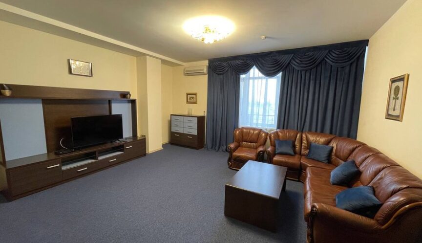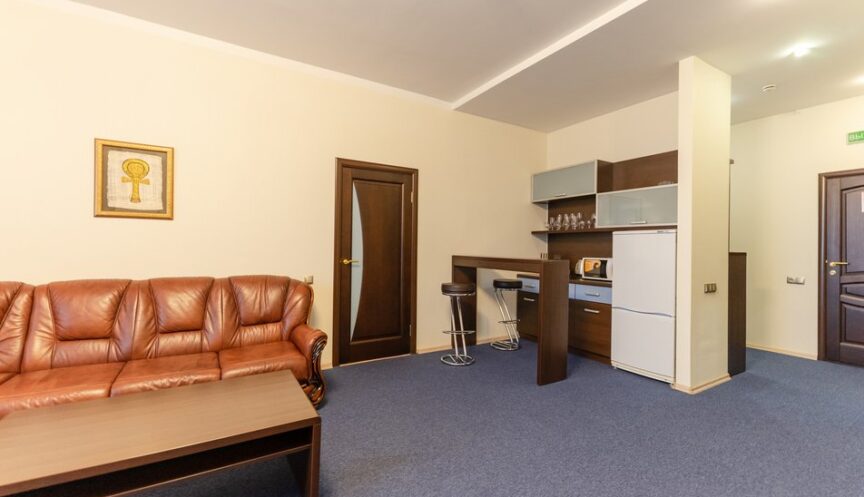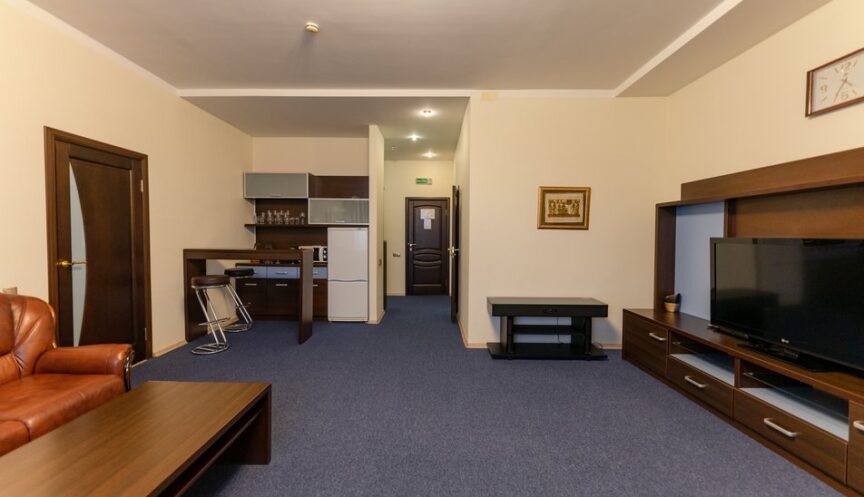 Апартаменты в двухкомнатном номере оснащены всем необходимым для комфортного проживания. В номере есть 2-спальная кровать с прикроватными тумбочками, диван, шкаф для одежды, стол и стулья. Имеется вешалка для одежды и зеркало. Есть набор посуды, телевизор, холодильник и электрочайник. Санузел с душем.