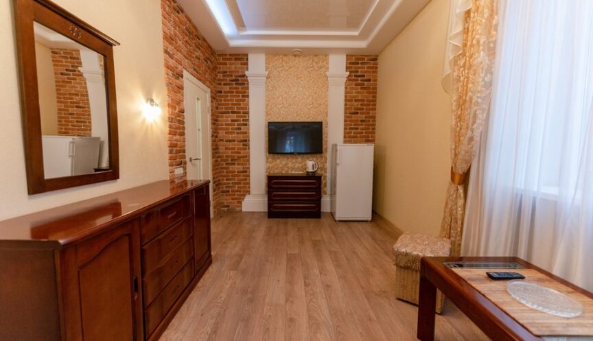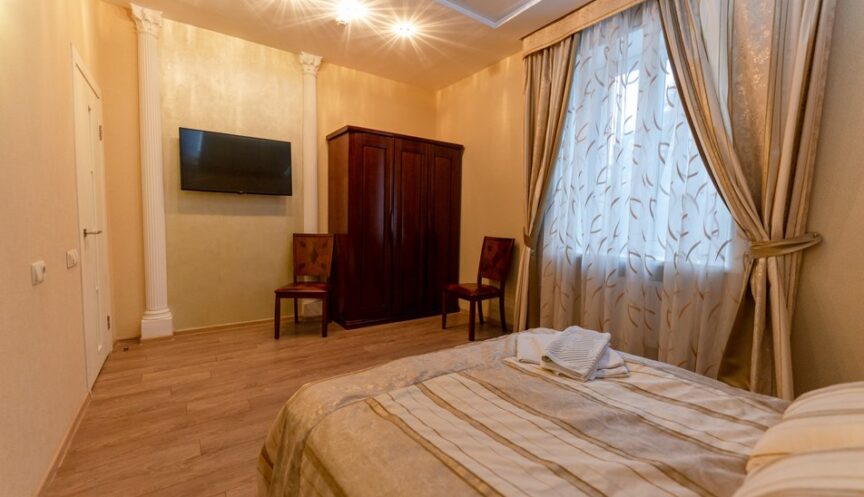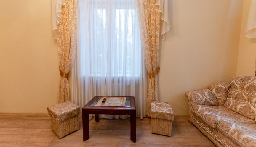 Двухкомнатный люкс в корпусе 3. В номере есть необходимая мебель: вешалка, диван раскладной, зеркало, кресла, две полутороспальные кровати с прикроватными тумбочками, журнальный столик, стулья, шкаф и шкаф для посуды. Из оборудования предоставляются набор посуды, телевизор, холодильник и электрочайник. Санузел оснащён душевой кабиной.