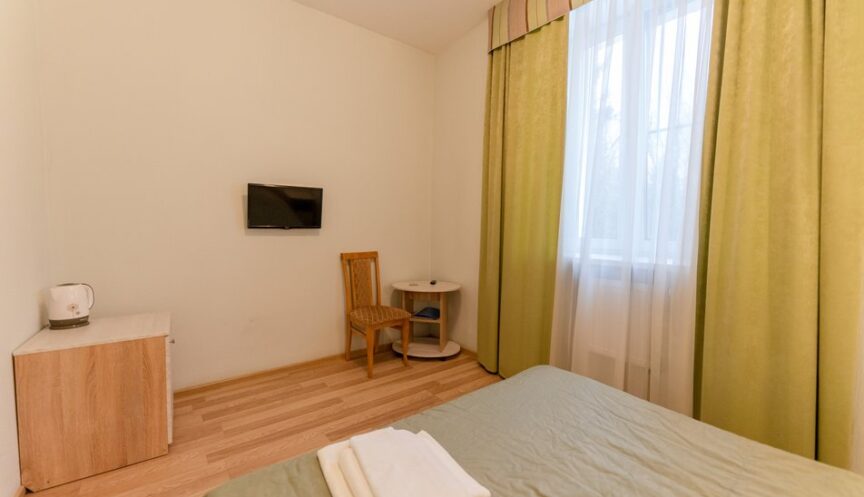 Стандартный однокомнатный номер в третьем корпусе. В номере есть всё необходимое для комфортного проживания: двуспальная кровать, прикроватная тумбочка, стол, стул, шкаф, вешалка и зеркало. Также в номере установлен телевизор. Санузел с душем оснащён феном.